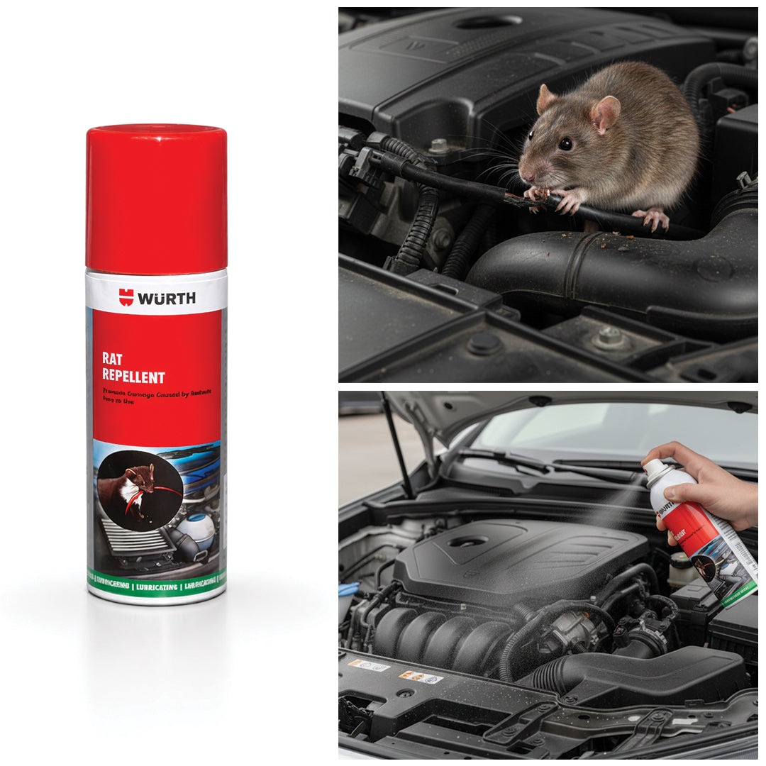 Protect your vehicle from costly rodent damage with Würth Rat Repellent Spray, a professional-grade solution designed to repel rats and rodents from vehicle engine bays and other vulnerable areas. The formulation creates an unpleasant surface layer that discourages rodents from nesting, biting, or damaging cables, hoses, and components.
